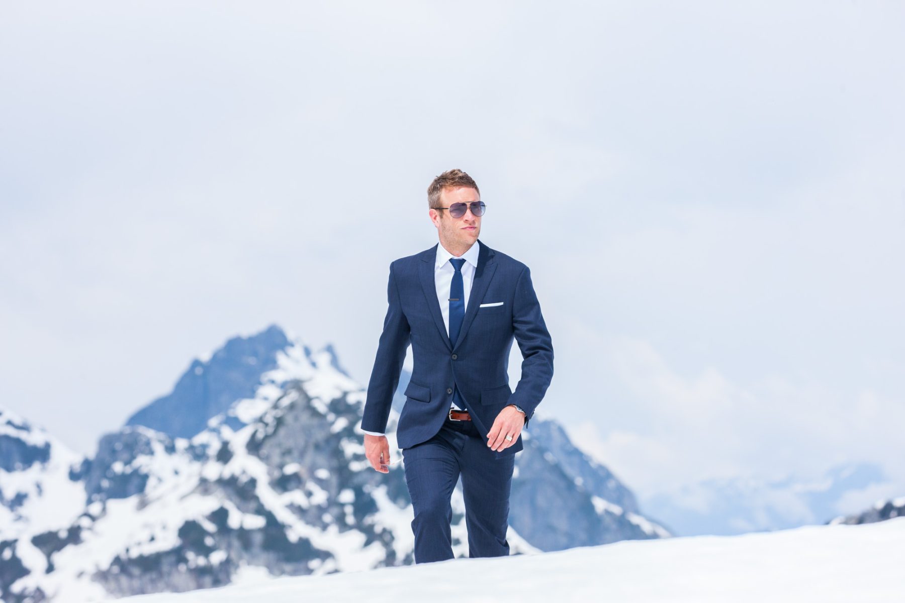 Indochino called: “We’ve got a waterproof, stretch-wool suit. We want Jay DeMerit to wear it at the top of a mountain, while you shoot him from a helicopter.” The answer was yes. Aerial commercial photography at its most literal.
